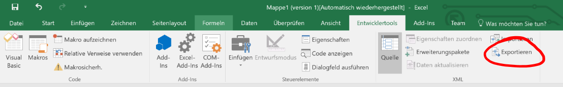 * Um die Daten aus Microsoft Excel zu exportieren, wählen Sie im Menü "Entwicklertools" den Eintrag "Exportieren"