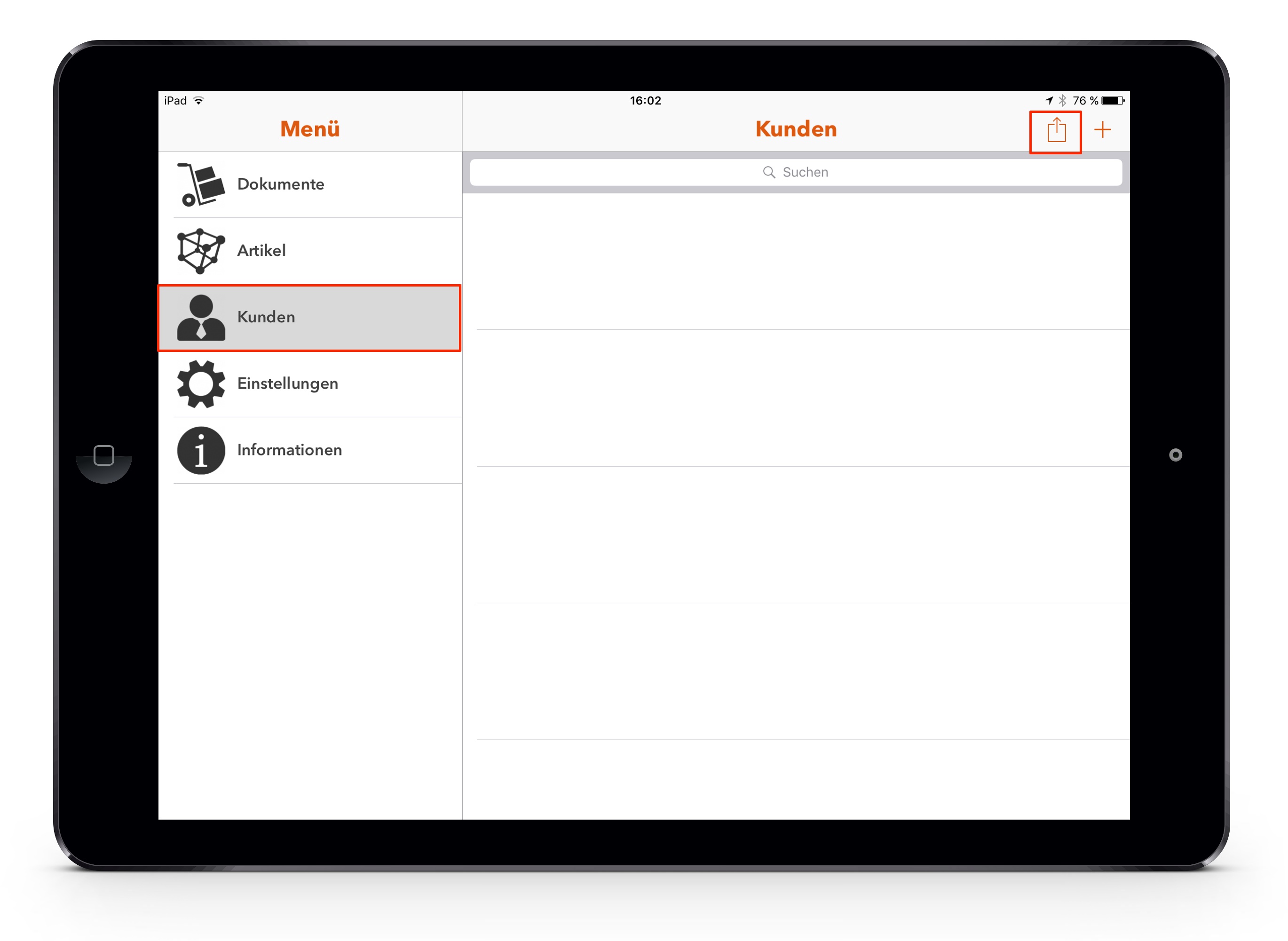 * Wählen Sie den Bereich "Kunden" und tippen Sie auf den Action-Button (rechts oben)