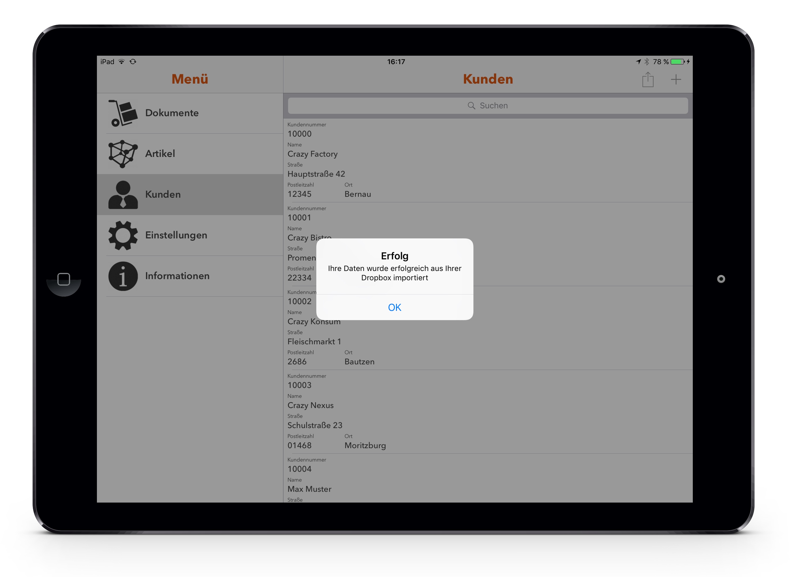Öffnen Sie die Crazy Beleg App auf Ihren iDevice. Als Beispiel sollen die Kunden importiert werden.
