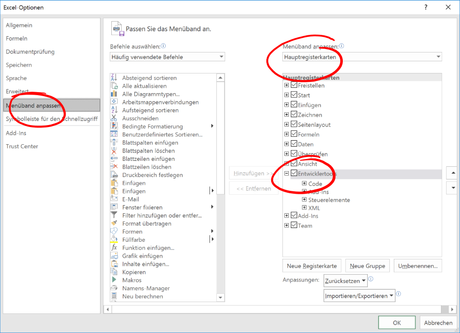 * Klicken Sie auf die Option „Menüband anpassen“ und aktivieren in der Rubrik „Menüband anpassen“ den Eintrag „Entwicklertools"