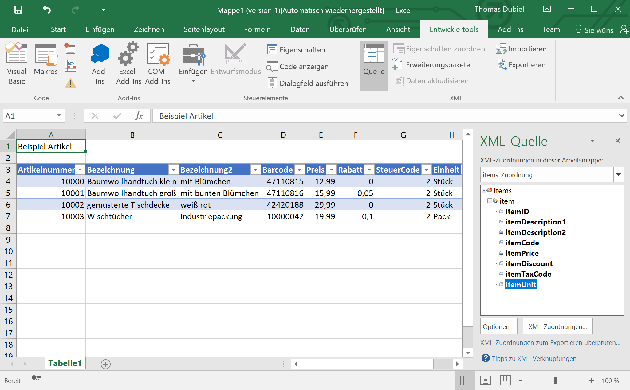 * Nach der Zuordnung der XML-Elemente zu den Werten in der Tabelle sollte Ihre Arbeitsmappe in etwa so aussehen: