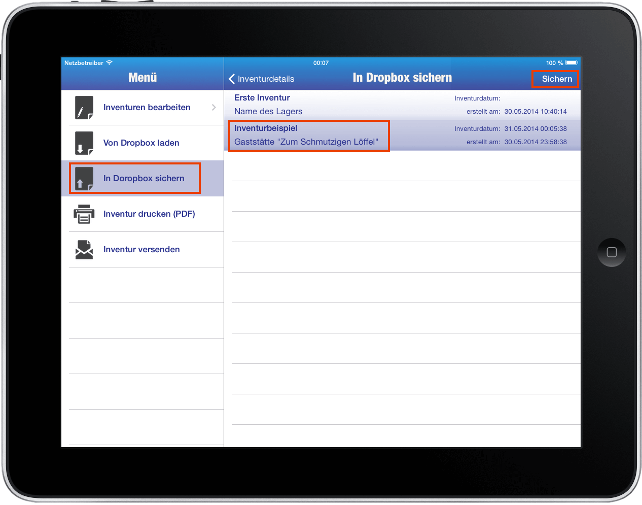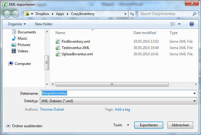 * Speichern Sie die Datei in Ihrer Dropbox im Verzeichnis "Apps/CrazyInventory" und klicken Sie anschließend auf die Schaltfläche "Exportieren"