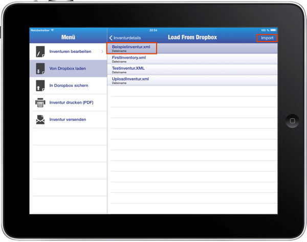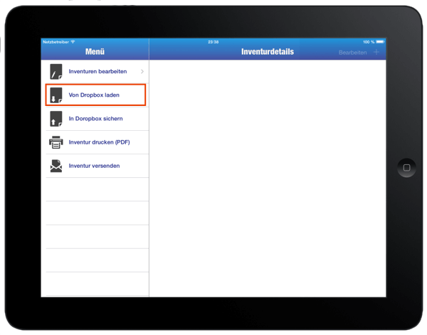 * Öffnen Sie die App und wählen im Menü "Von Dropbox laden"