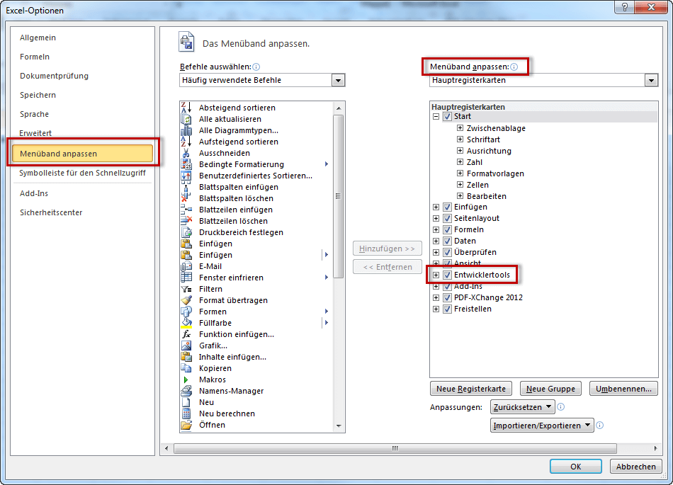 * Klicken Sie auf die Option „Menüband anpassen“ und aktivieren in der Rubrik „Menüband anpassen“ den Eintrag „Entwicklertools"