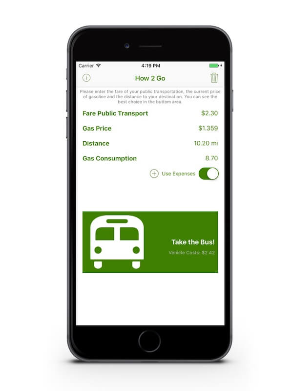 The project is designed for the iPhone. It should be taken with as few inputs a reliable statement whether the upcoming trip should better be done by public transport or your own vehicle.