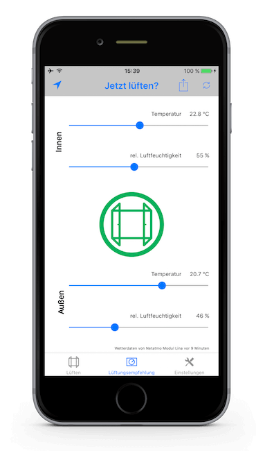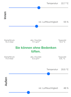 Ist Ihr Gerät mit dem Internet verbunden und haben Sie dem Lüftomat erlaubt Ihren aktuellen Standort zu ermitteln wird die Außentemperatur und die Luftfeuchtigkeit über den Wetterdienst von OpenWeatherMap ermittelt. Sie müssen jetzt nur noch die Temperatur und Luftfeuchte im Innenbereich einstellen und können ablesen ob das Lüften jetzt gerade möglich ist.
