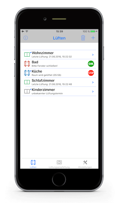 Die Hauptansicht soll Ihnen schnell einen Überblick verschaffen was zu tun ist. Welche Räume werden gelüftet und in welchen Raum müssen Fenster geschlossen werden?