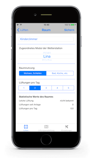 Hier können Sie den Namen des Raumes festlegen und die Anzahl der Lüftungen erfassen. Wohn- und Schlafräume sollten zweimal täglich gelüftet werden. Bäder und Küchen sollten drei bis viermal täglich je nach Feuchtigkeitsbelastung gelüftet werden. Anhand der Raumnutzung können Sie schnell Ihre Auswahl treffen. Der Vorschlagswert für die Anzahl der Lüftungen pro Tag kann in den Einstellungen festgelegt werden. Im unteren Bereich finden Sie statistische Werte über Ihren Raum wieder. Diese Werte können Ihnen einen Hinweis darauf geben ob Ihr Lüftungsintervall ggf. verändert werden muss. In dieser Ansicht können Sie dem Raum ein Innenraum Modul zuordnen, welches der verbundenen Netatmo Wetterstation angehört. Diese Zuordnung wird später beim Start einer genutzt um die Bedingungen für eine Lüftung zu prüfen.