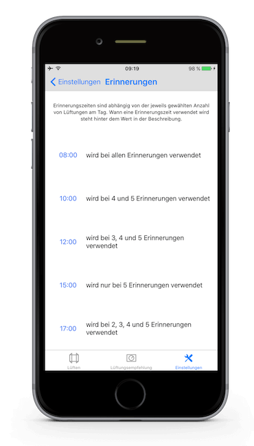 Durch antippen der Zeit können Sie Ihre individuelle Zeit für jede der fünf Erinnerungszeiten festlegen. Welche Zeit verwendet wird hängt von der Anzahl der Lüftungen ab die für einen Raum gewählt wurde.