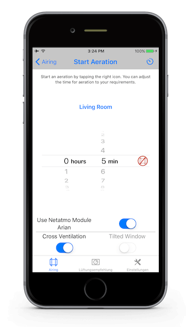 Tap on a room in the main screen and you starting a new aeration. You can start a aeration very fast if you tap on the icon top right. Let's go!