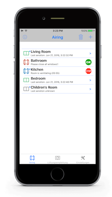 The main screen gives you a overview about the current situation und required actions. Which rooms have to be ventilated and in which room are open windows.