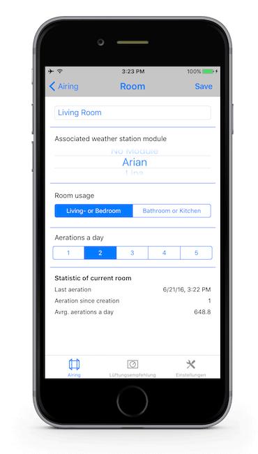 Here you can enter a unique name for your room and define the number of aerations a day. Living and bedrooms should be aired twice a day. Bathrooms and kitchens need to be ventilated three to four times a day. Use the Room usage selector and choose a value very easy. You can change the value for the aeration a day in the settings. The buttom area shows statistical information of your room. These value can help you to check your ventilation behavior. In this view you can assign a room to a Indoor Module of your Netatmo Weather Station. This connection is used to check the conditions when a new aeration will start.