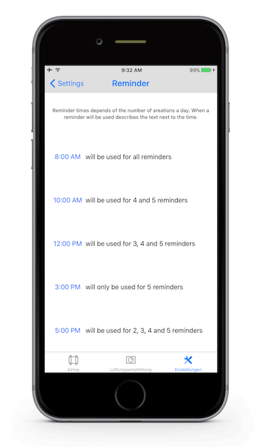 In a subsequent version of the ventilation reminder should be revised. It should be possible to maintain individual reminder times for each room. In this context, the display for about ventilating rooms should be revised. This should be recognized directly in the main view.